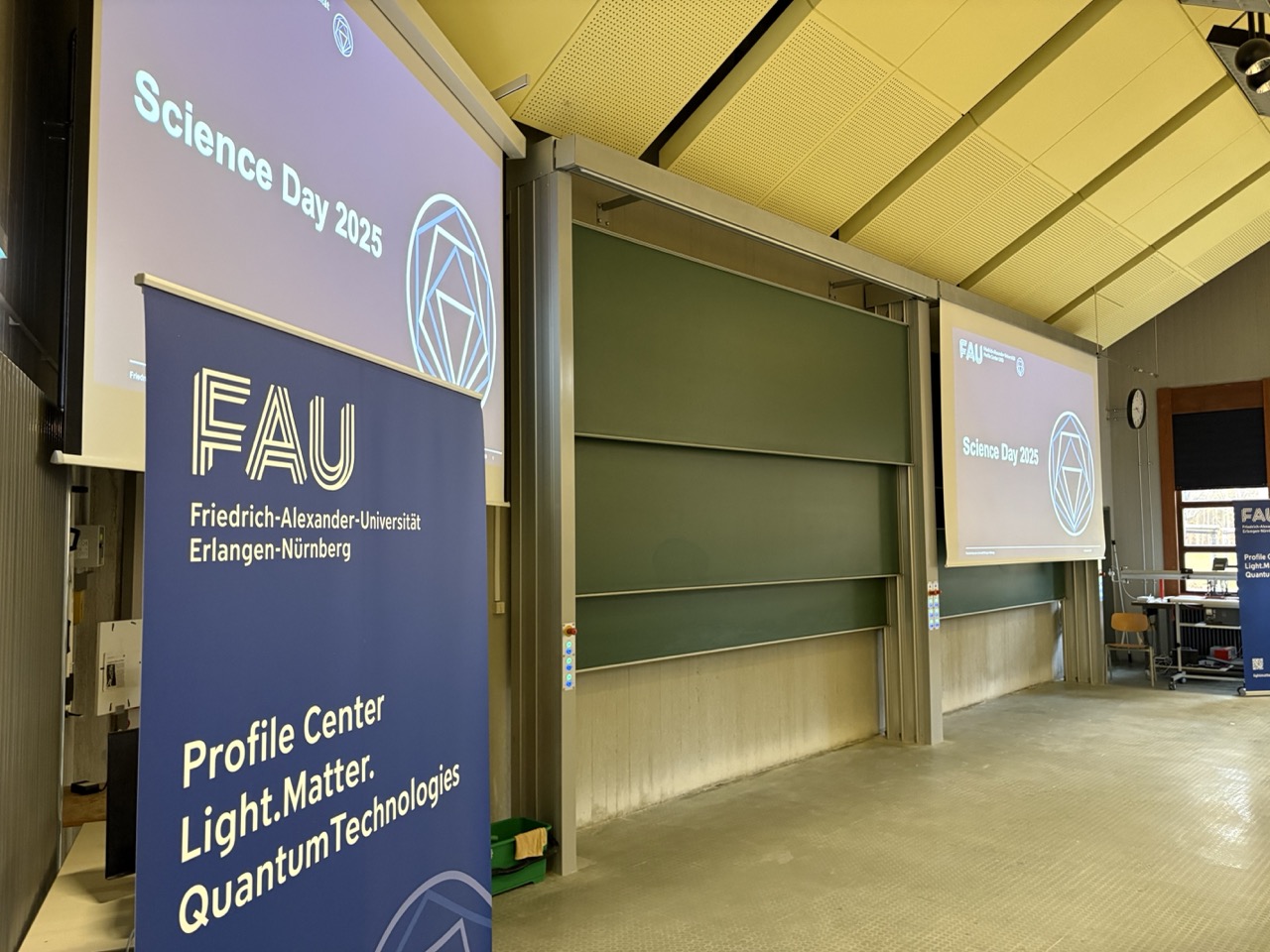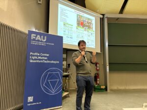 On November 12th, the first FAU LMQ Science Day took place at the Physikum in Erlangen. This event brought together all research teams of the FAU LMQ, showcasing their findings in the fields of light, matter, and quantum technologies. The day featured talks about material design through cavities by Daniele Fausti, treating and improving on quantum error correction in quantum computing by Michael Hartmann, and current developments in quantum sensing used for improving the life time of batteries by Roland Nagy. Additionally, a poster session with approximately 40 contributions provided further insights into the research being conducted.