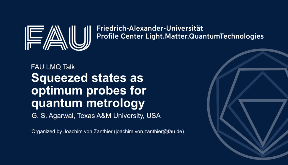 We are pleased to announce a FAU LMQ Talk on Friday, November 14th, at 14:00, at lecture hall G, Department of Physics, Staudtstraße 5, Erlangen. The talk, titled “Squeezed states as optimum probes for quantum metrology” will be presented by Prof. Girish Agarwal from the Texas A & M University (TAMU).
