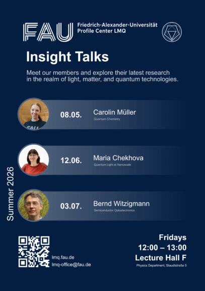 This semester, we continue the FAU LMQ Insight Talk series given by members of the FAU LMQ. These talks are a great opportunity to see the research being conducted by our members and their groups. The talks are open to everyone. Coffee and drinks will be provided.